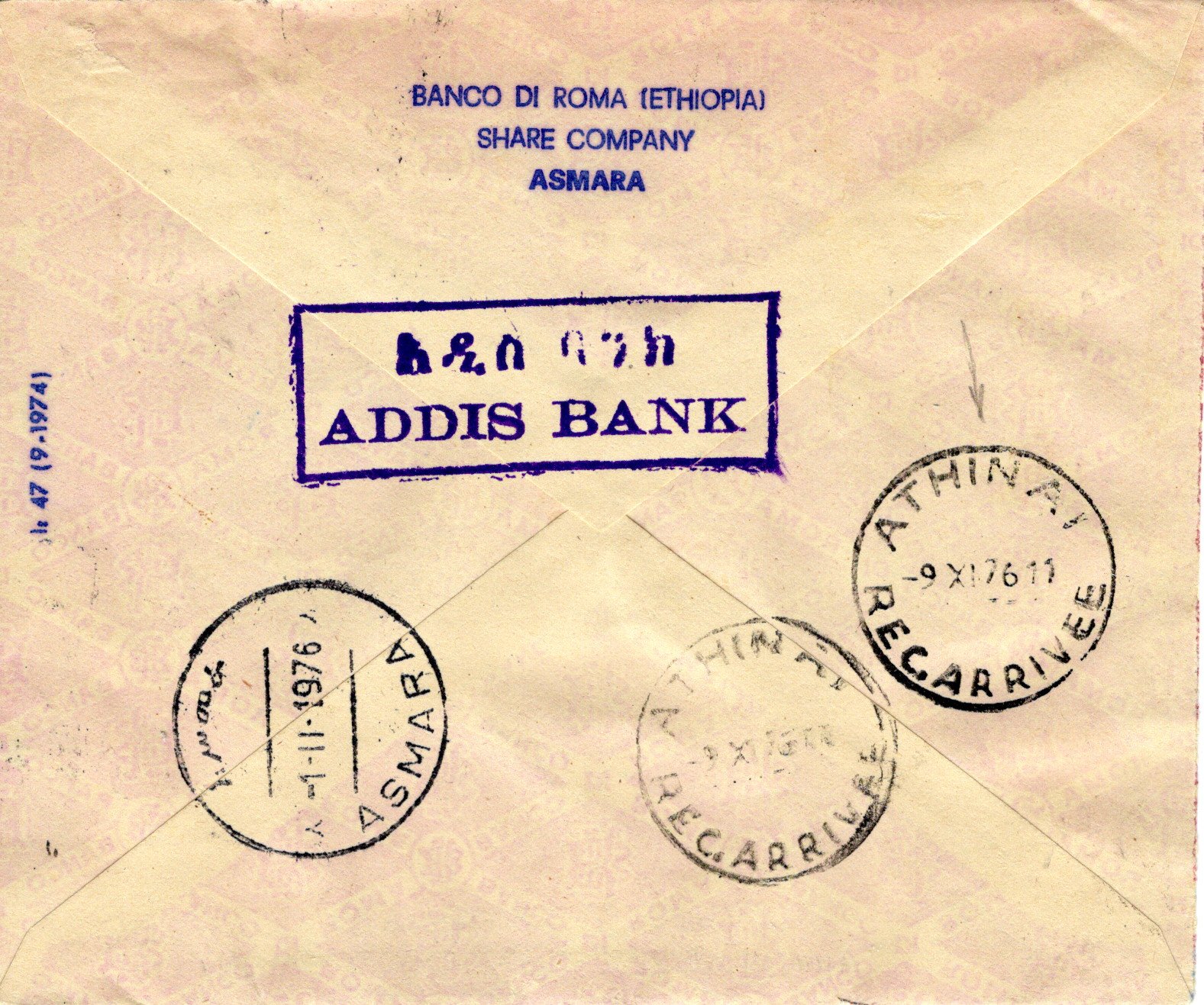 ![]() External registered letter from Addis Ababa to Athens, Greece. 1 November 1976 Asmara cancel. 9 November 1976 Athens registered receiving (Rec. Arrivee) receiving cancel. $1.55 over pays by 10C the expected rate of $1.45: 70C for one weight unit (up to 10 grams) + 75C registration fee. Eight days transit time. Last Update: January 9, 2026 |