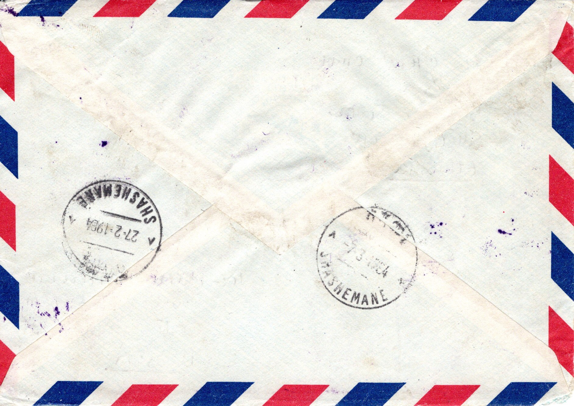 ![]() External air mail from Buta Jira to Fontana, California, USA. 29 February 1984 Buta Jira Sub Post Office cancel. 7 March 1984 Shashemane transit cancel. Also a misdated Shashemane transit cancel dated 27 February 1984. 3.25B over pays the expected rate of 3.20B by 5C: 2.20B for two weight units (1.10B per unit, up to 20 grams) +1.00B registration fee. Note manuscript registration number in red ink and correct rate written in blue ink near left of top center. Last Update: February 5, 2026 |