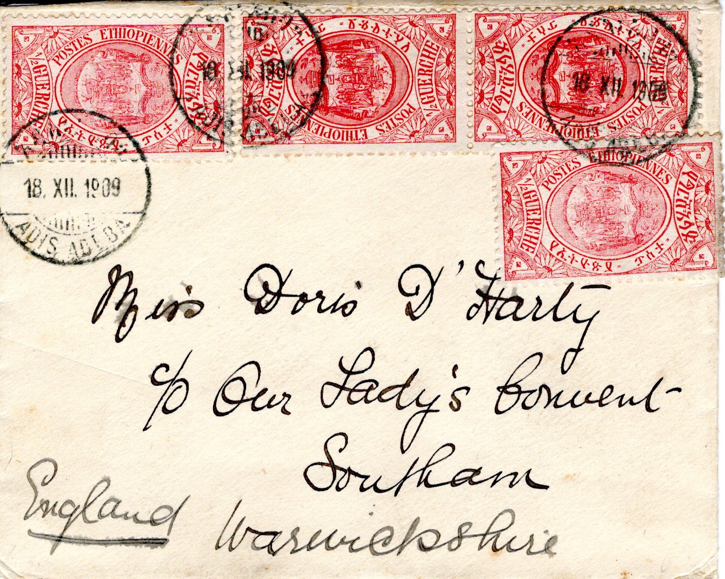 18 December 1909 Addis Ababa cancel. 8 January 1910