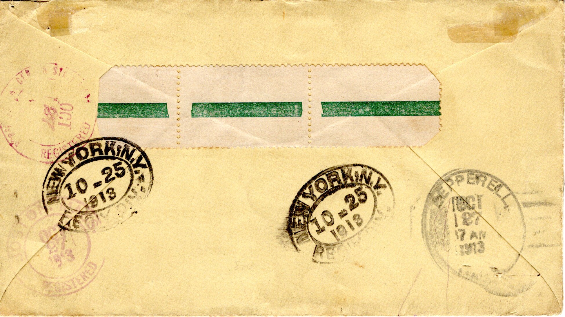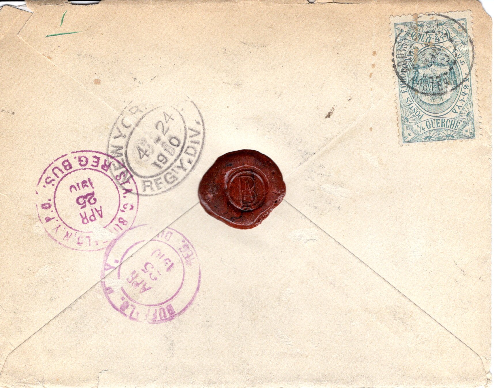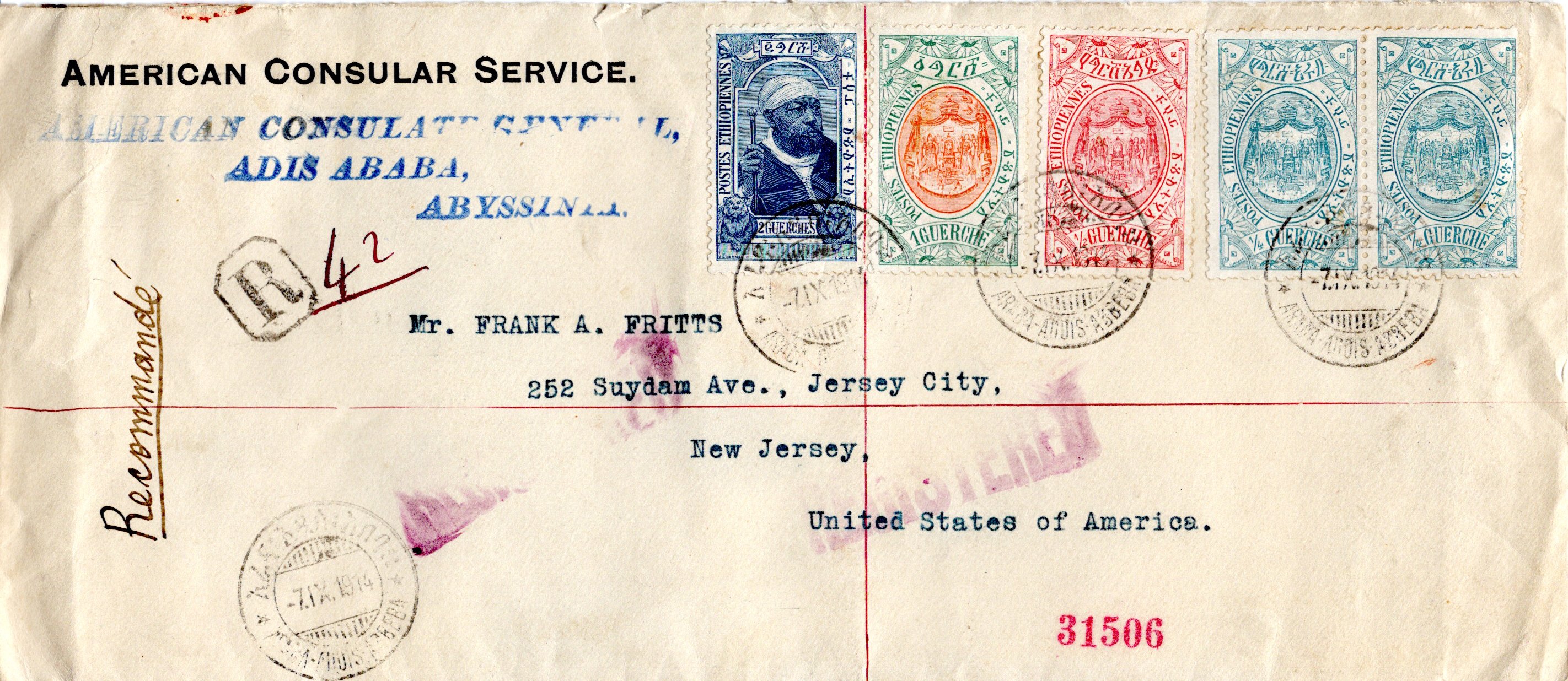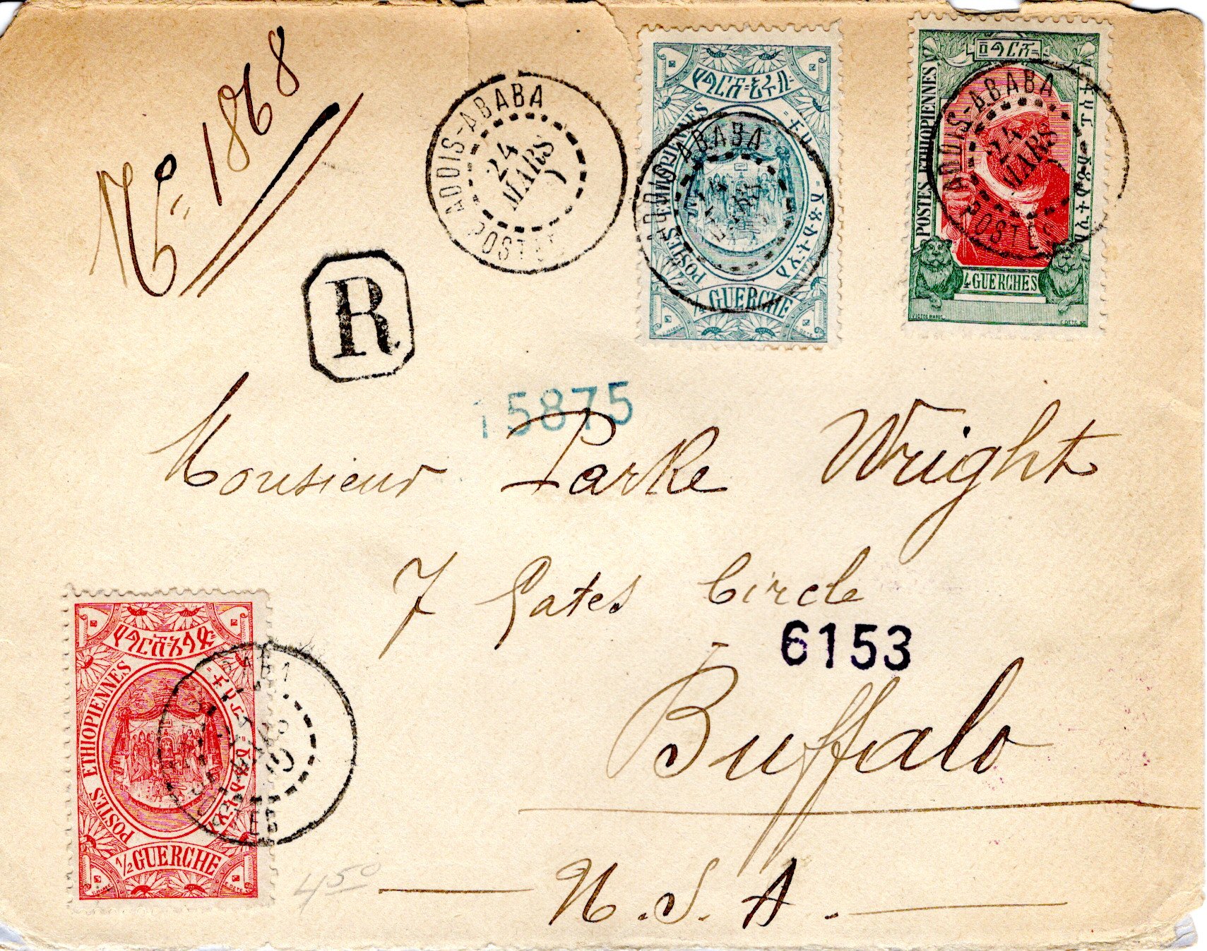24 March 1910 Adis Ababa cancel. 24 April 1910 New York