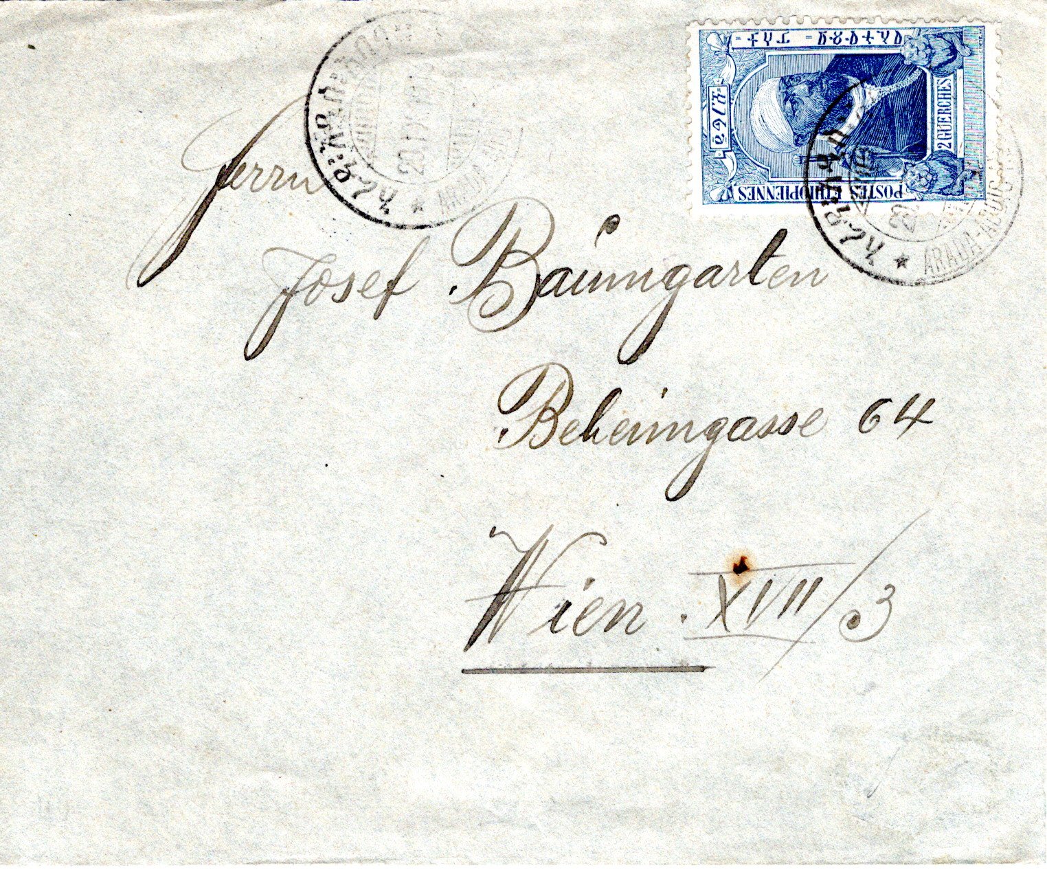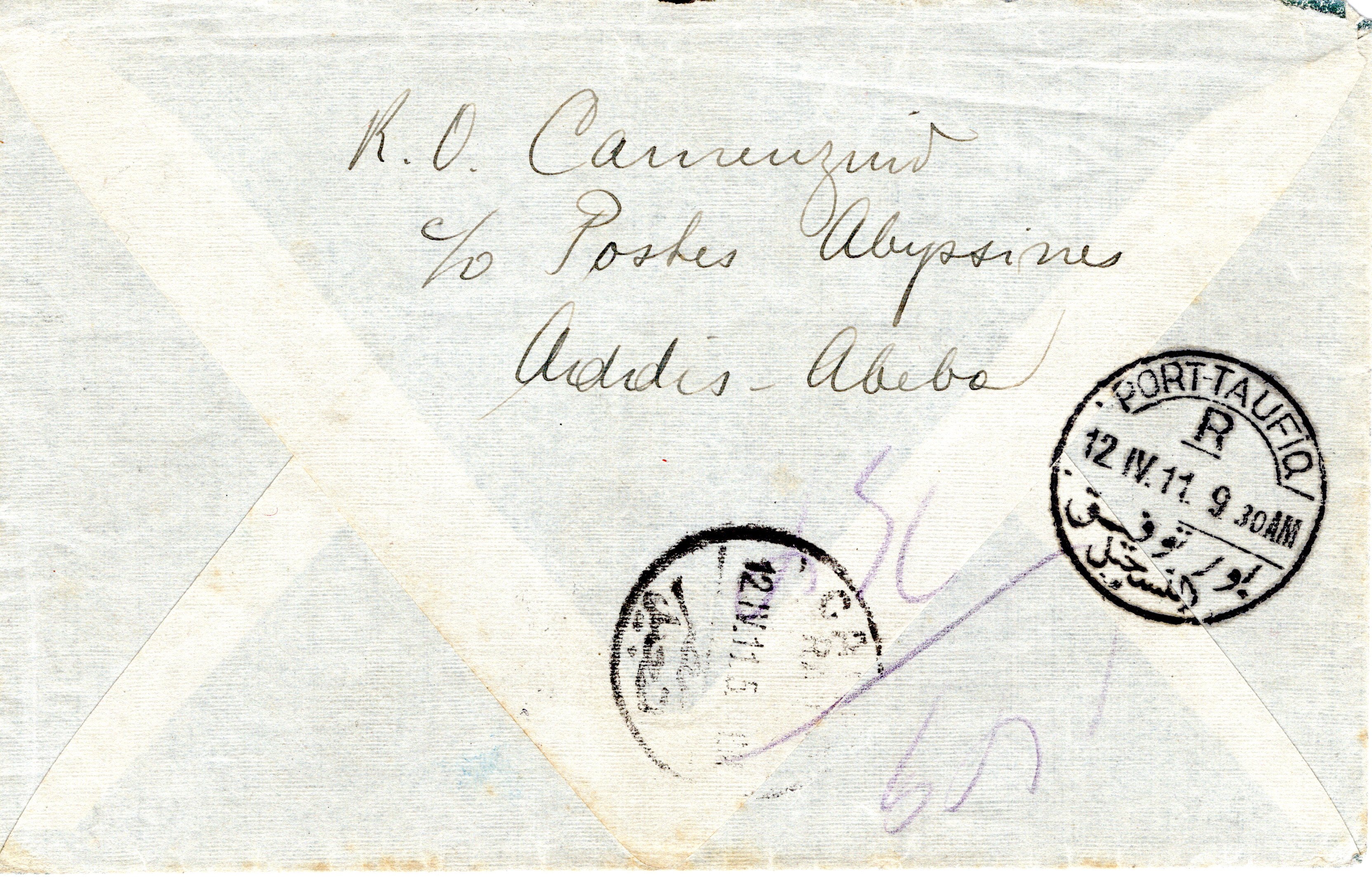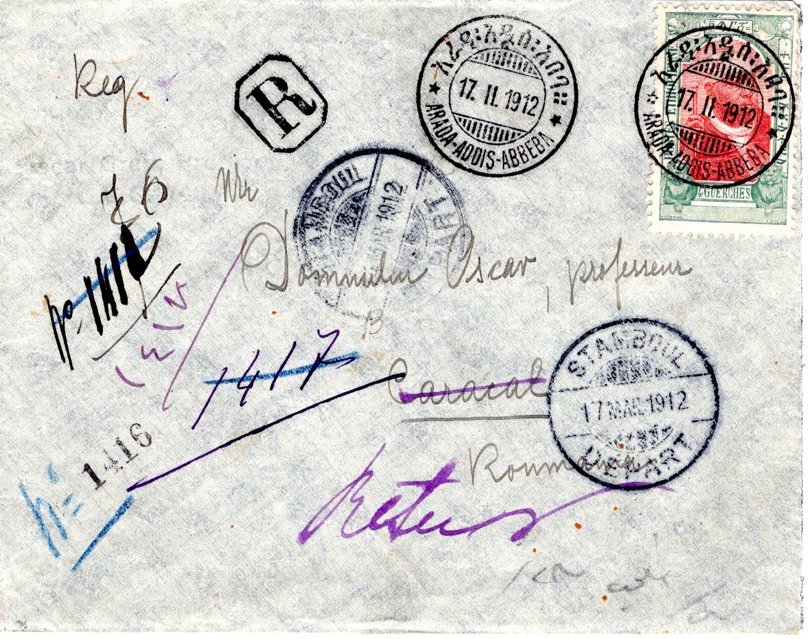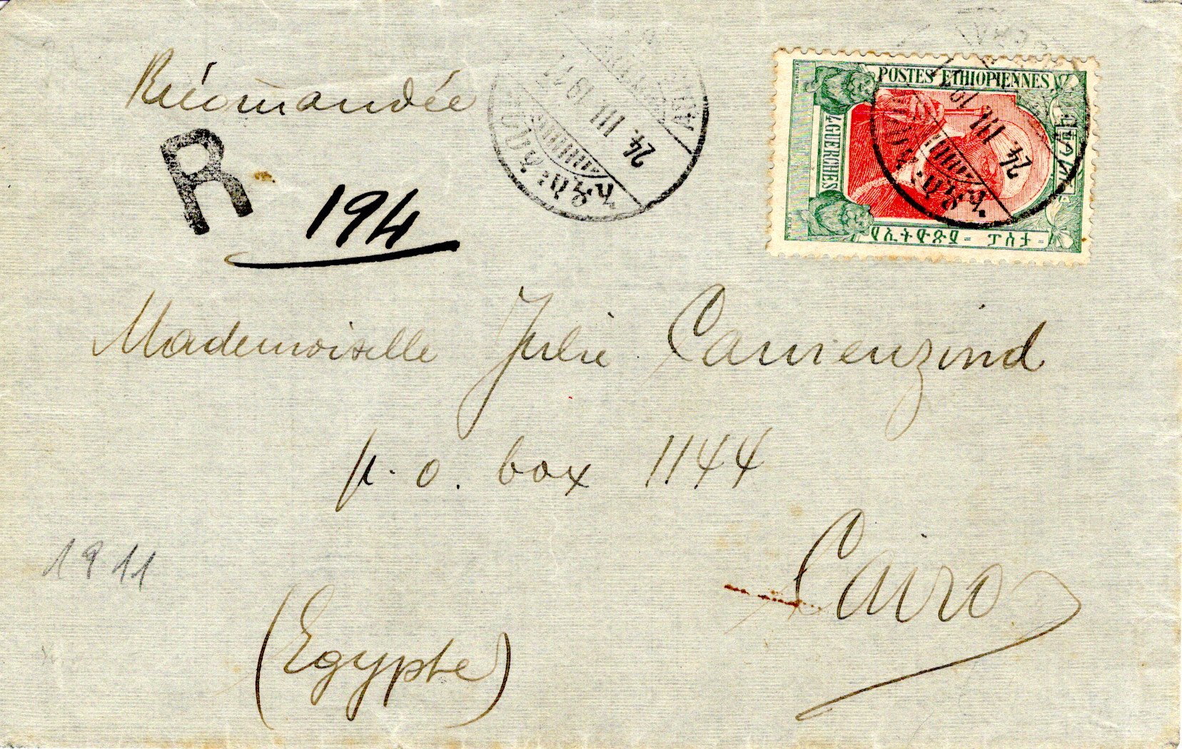 27 May 1910 Addis Ababa cancel. 29 June ??? Certificado
