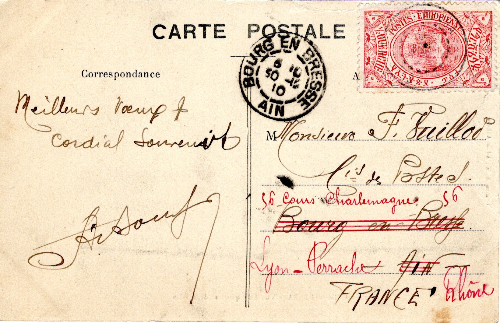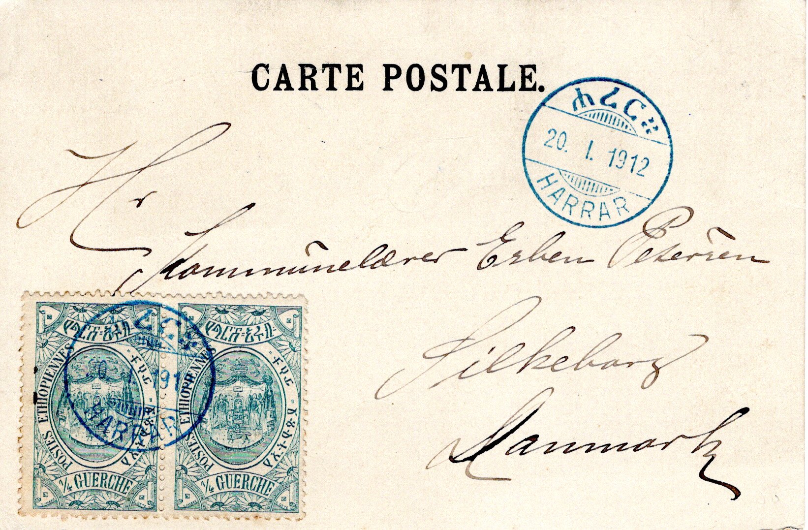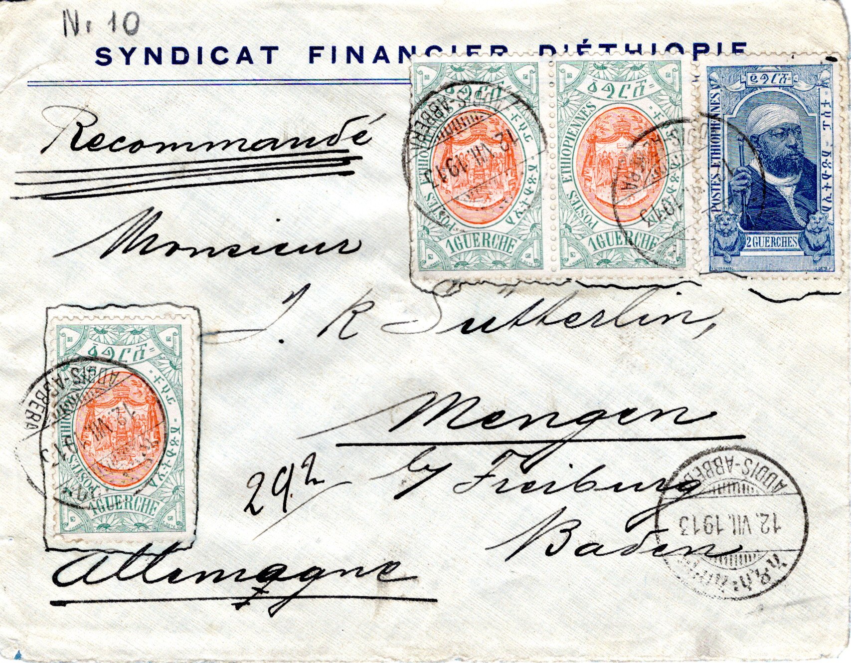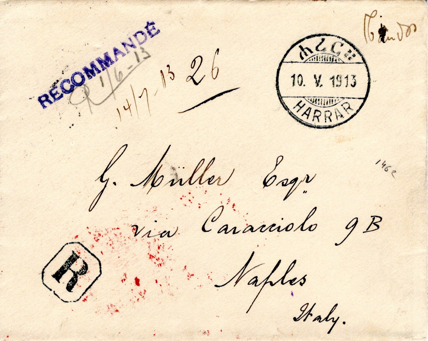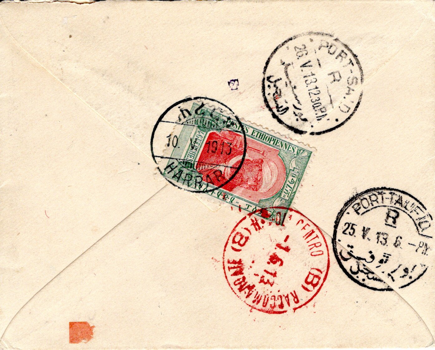 27 May 1910 Addis Ababa cancel. 29 June ??? Certificado