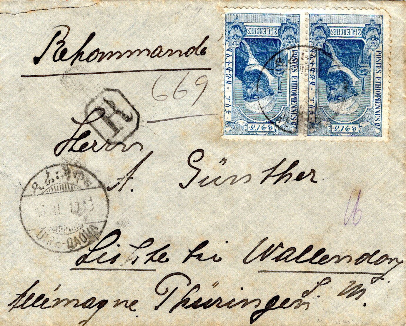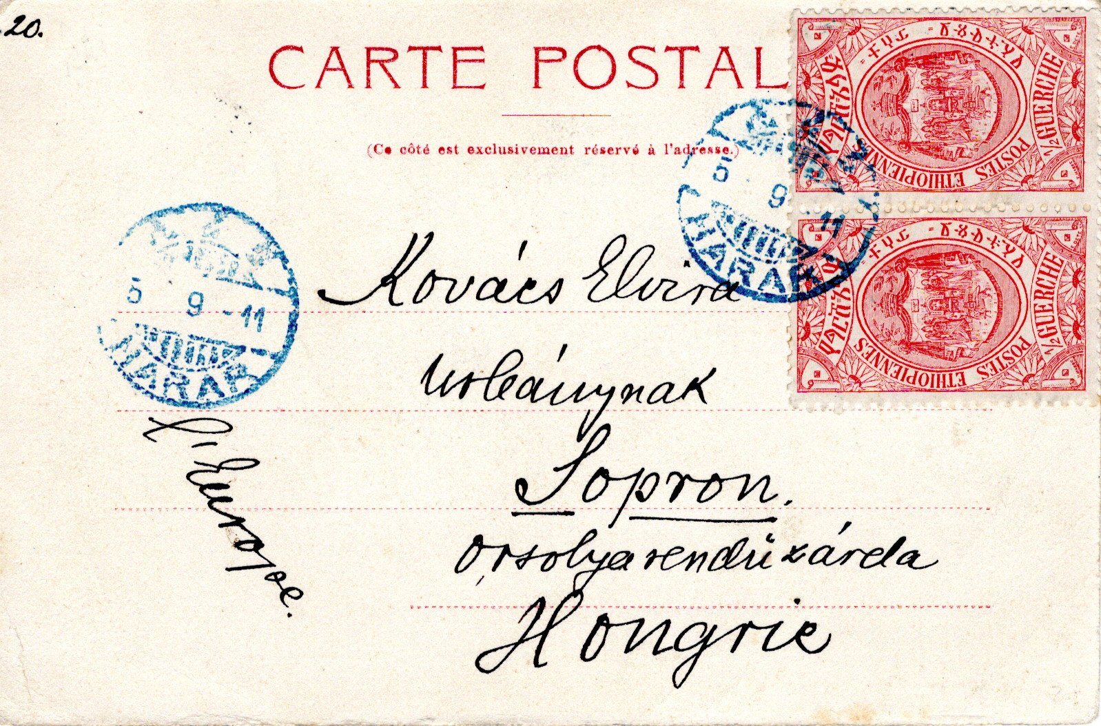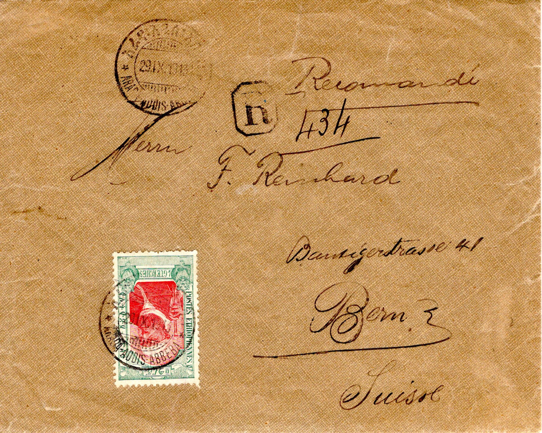 10 September 1909 Adis Abeba cancel. 29 September 1909