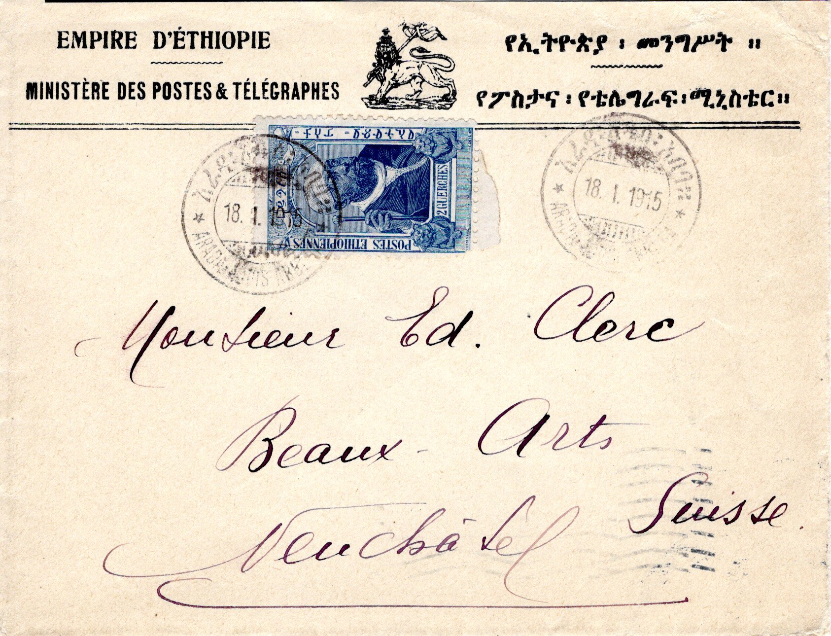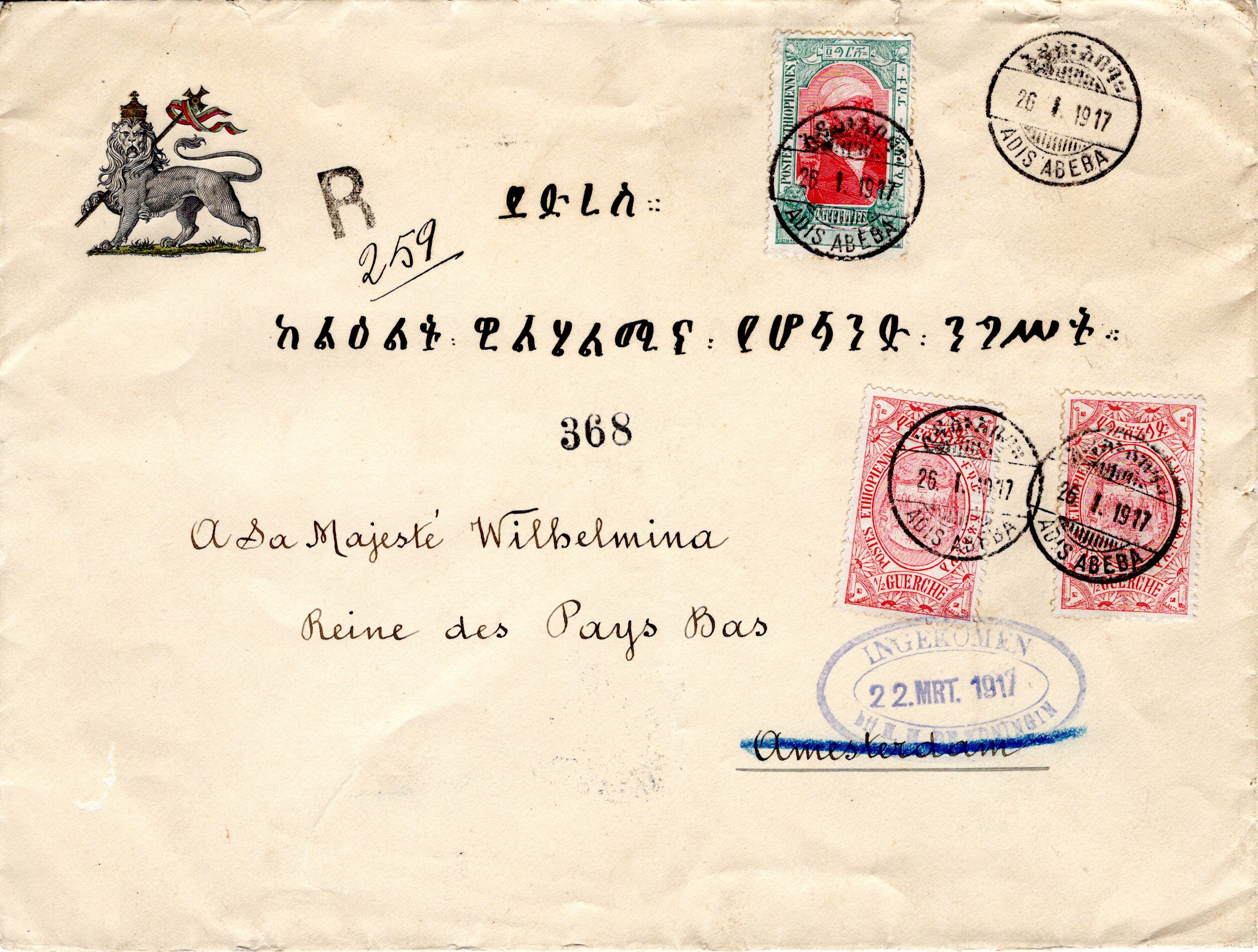 26 January 1917 Addis Ababa cancel. 22 March 1917