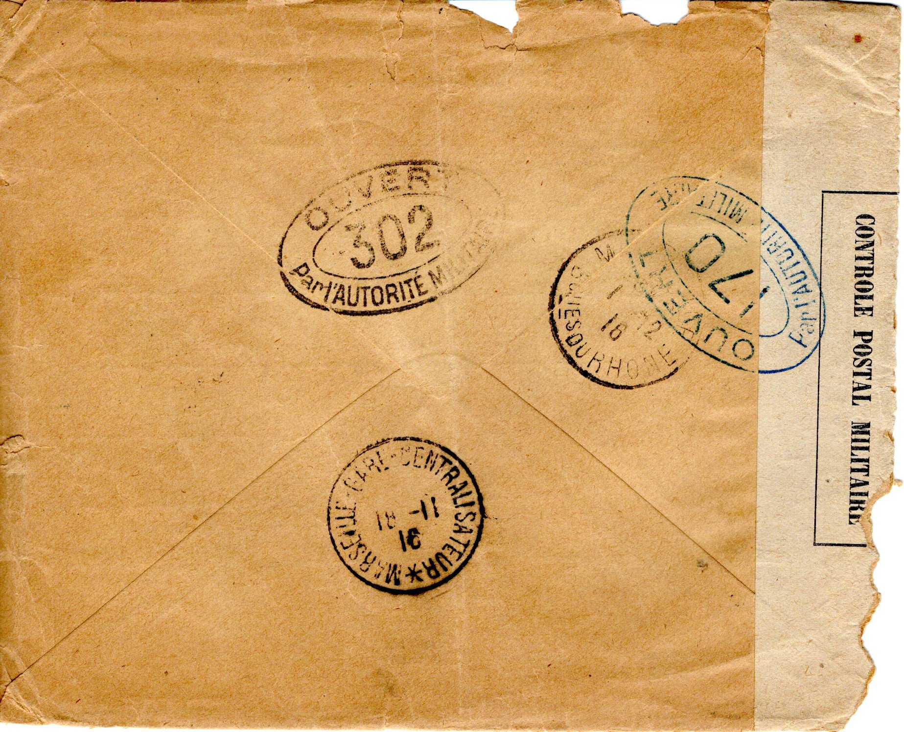tape, Ouvert Par l’Autorité Militaire 302 handstamp in